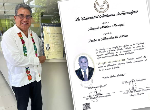Noticiaspc.com.mx | Altamira, Tamps.- Armando Martínez Manríquez, alcalde de Altamira ha sido distinguido por la Universidad Autónoma de Tamaulipas (UAT) con el grado de Doctor en Administración Pública, junto con una mención honorífica que reconoce su esfuerzo y brillante trayectoria académica.  Dicha distinción fue otorgada en la Facultad de Derecho y Ciencias Sociales Victoria, donde Martínez completó sus estudios. El alcalde de Altamira, es oficialmente Doctor en Administración Pública hizo pública su reciente acreditación a través de su cuenta de Facebook, donde expresó: “Es un timbre de orgullo recibir mi Título Profesional que me otorga el grado de Doctor en Administración Pública, además con Mención Honorífica. Mi agradecimiento a la impulsora de todos los proyectos de mi vida, a mi esposa Rosa Irma. Gracias amor por estar siempre presente en las metas que me he propuesto en la vida, lo que ha fortalecido nuestro amor ahora compartido para nuestro pueblo. Gracias a mis hijos Armando, Miguel Ángel y mi nena hermosa Rosita por darme de su tiempo para lograr este alto nivel de preparación durante tres años. Gracias Papá, Mamá y hermanas Aracely y Anel y a mis hermanos que ya están en el cielo Tokio y Juanito, por animarme y apoyarme para lograr este objetivo que ahora aplico en mis decisiones, que día a día tomo en beneficio de nuestra ciudad, que por mandato del pueblo de Altamira, cumplo con gran responsabilidad y compromiso y a mi Alma Mater la Universidad Autónoma de Tamaulipas mi eterno agradecimiento a sus catedráticos por su alto nivel competitivo y compromiso con la sociedad de formar profesionistas de excelencia. Muchas gracias a todos quienes participaron en este gran logro”. Cabe mencionar que Armando Martínez actualmente se desempeña como presidente municipal (2021-2024) y ha sido reelecto por la ciudadanía para un segundo mandato que abarcará el periodo de 2024-2030. Su reelección contó con más de 70 mil votos, reflejando una aceptación del electorado superior al 70%, superando las proyecciones de las encuestas que ya auguraban su victoria.