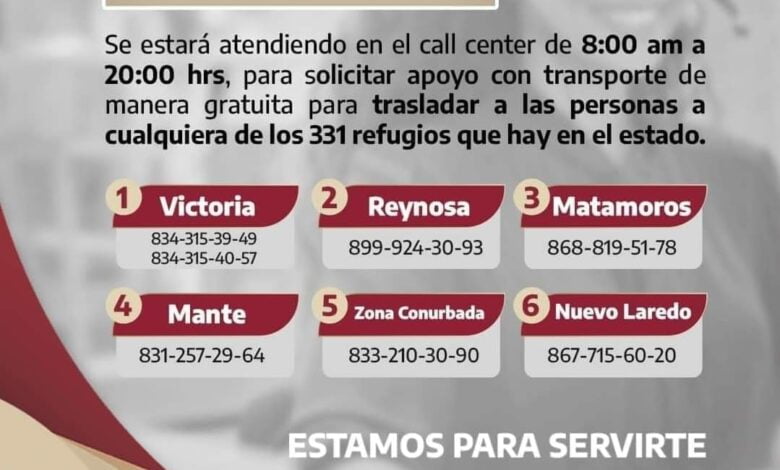 Agregó que para solicitar el traslado a los albergues, se ponen a disposición de la ciudadanía los teléfonos de las delegaciones de Transporte Público en el estado: en Ciudad Victoria al 834 31 539 49 y 834 31 5 40 57; Nuevo Laredo, 837 715 60 20; Reynosa, 899 924 30 93; Matamoros, 868 819 5178; Zona Conurbada, 833 210 30 90 y El Mante, 831 257 29 64.